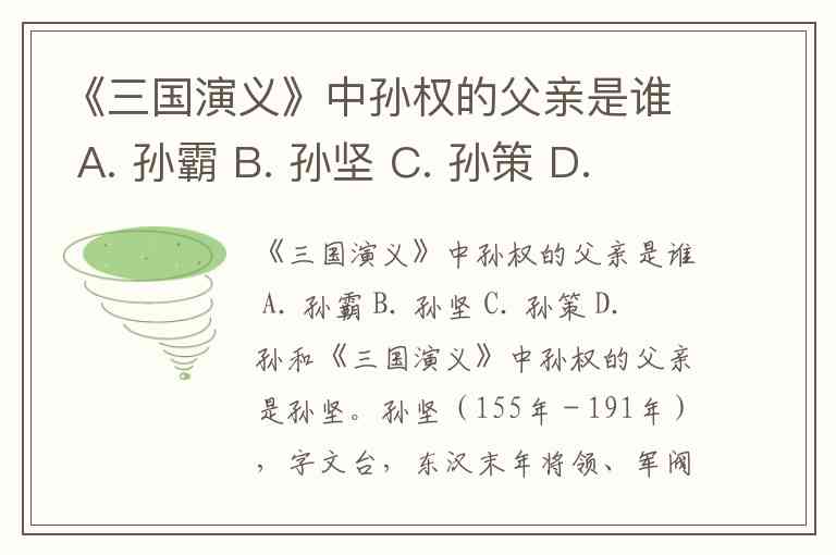 《三国演义》中孙权的父亲是谁 A. 孙霸 B. 孙坚 C. 孙策 D. 孙和