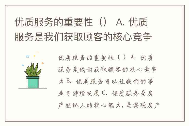 优质服务的重要性() A. 优质服务是我们获取顾客的核心竞争力 B. 优质服务可以让我们的事业可持续发展 C. 优质服务是房产经纪人的核心能力,是实现房产经纪人价值的唯一方式 D. 优质服务只针对客户、业主