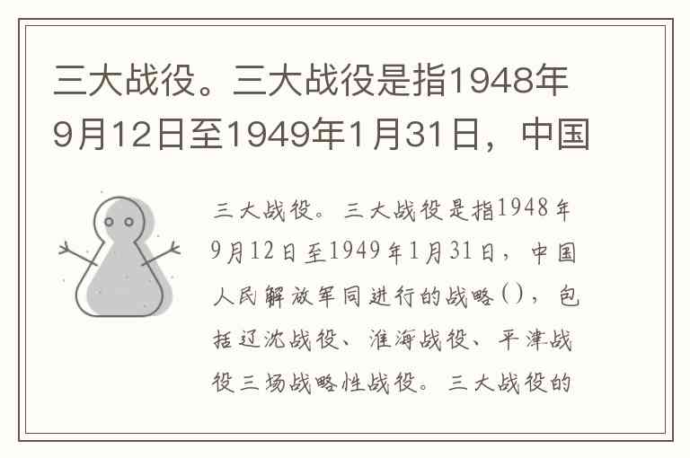 三大战役是中国人民解放军与国民党军队进行的战略决战,发生于1948年9月至1949年1月,历时142天,共歼灭和改编国民党军队约154万人,基本摧毁了国民党赖以维持统治的主力部队,为中国革命在全国的胜利奠定了决定性基础。这三场战略性战役体现了毛泽东军事思想的实践运用,也是人民战争路线的集中体现,标志着中国革命进入全面胜利的转折点。