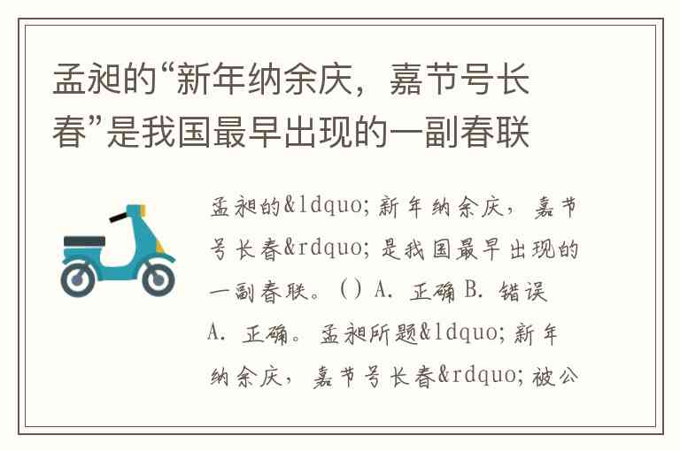 孟昶的“新年纳余庆,嘉节号长春”是我国最早出现的一副春联。( ) A. 正确 B. 错误