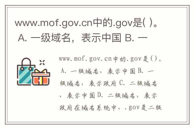 www.mof.gov.cn中的.gov是( )。 A. 一级域名,表示中国 B. 一级域名,表示政府 C. 二级域名,表示中国 D. 二级域名,表示政府