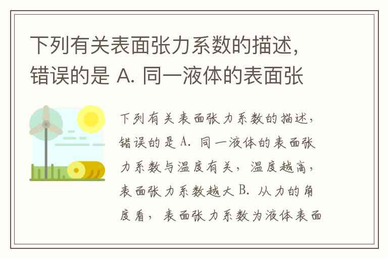 下列有关表面张力系数的描述,错误的是 A. 同一液体的表面张力系数与温度有关,温度越高,表面张力系数越大 B. 从力的角度看,表面张力系数为液体表面单位线长两旁所受到的表面张力 C. 从做功的角度看,表面张力系数表示增大单位表面积外力所需做的功 D. 从能量的角度来定义,表面张力系数为增大单位表面积所需要增加的表面能