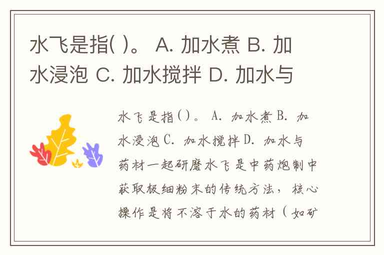水飞是指( )。 A. 加水煮 B. 加水浸泡 C. 加水搅拌 D. 加水与药材一起研磨