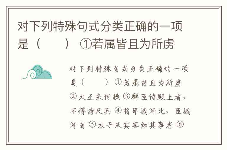 要准确分类文言文特殊句式,需先识别各句的语法特征。文言文常见特殊句式包括被动句、宾语前置、定语后置、省略句、判断句等,分析如下: