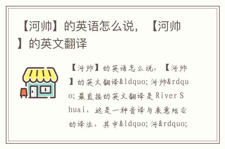 如果“河帅”是特定人物、品牌或文化符号的名称,建议优先使用 "Heshuai"(连写拼音)作为标准译法,这符合国际上对中文专有名词的常见处理方式(如“孔子”译为"Confucius"是例外,多数情况下直接采用拼音)。例如,若指历史人物或地方俗称,可表述为 "Heshuai (a historical title related to river management)" 以补充说明;若是现代品牌名,则直接使用 Heshuai 即可。