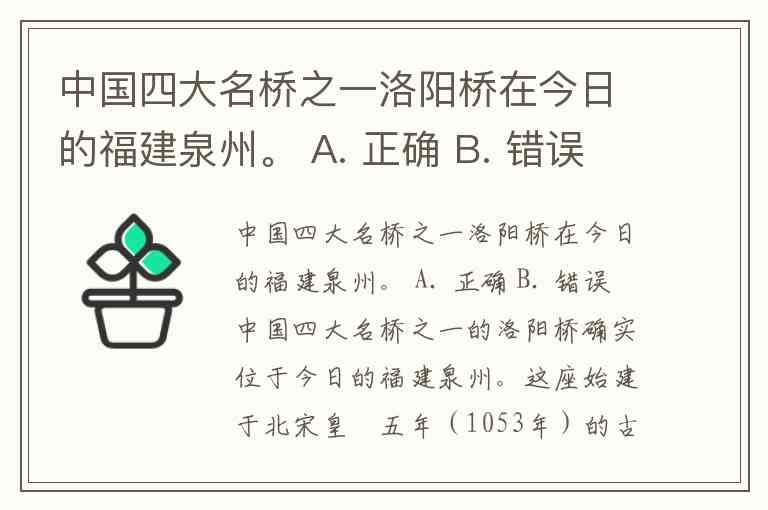 中国四大名桥之一洛阳桥在今日的福建泉州。 A. 正确 B. 错误