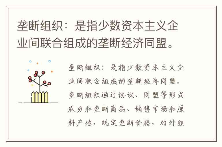 垄断组织是资本主义大企业通过联合控制生产、市场和价格以获取高额利润的经济同盟,其核心特征是生产集中到少数企业并形成市场垄断。根据历史发展规律,自由竞争必然导致生产集中,当某一部门大部分生产被少数大企业掌控时,它们为避免恶性竞争会达成协议,形成卡特尔、辛迪加、托拉斯等形式的垄断组织。例如19世纪末美国钢铁公司控制全国钢铁产量的43.8%,20世纪初通用汽车公司垄断54.2%的汽车市场,这些企业通过合并或协议操纵价格、划分市场,符合垄断组织的本质定义。
