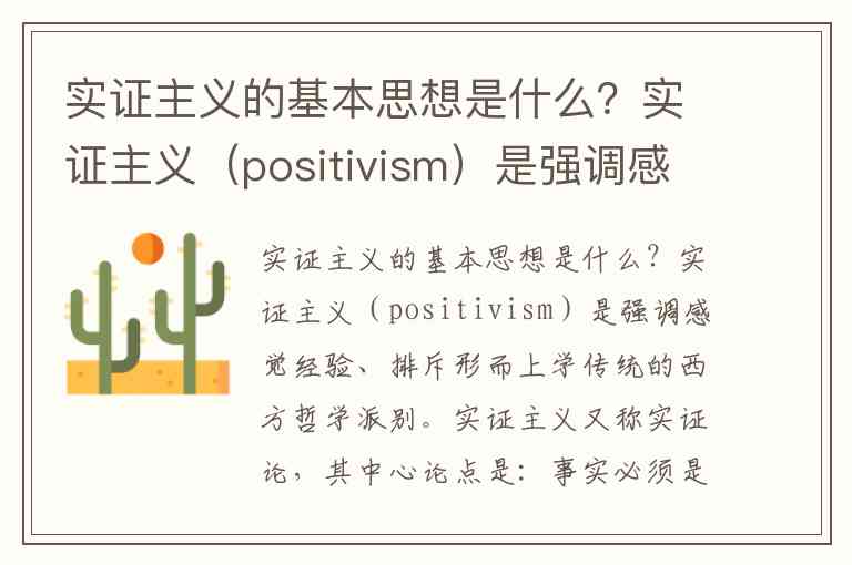 实证主义的基本思想是什么?实证主义(positivism)是强调感觉经验、排斥形而上学传统的西方哲学派别。实证主义又称实证论,其中心论点是:事实必须是透过观察或感觉经验,去认识每个人身处的__和外在事物。实证论者认为,虽然每个人接受的教育不同,但他们用来验证感觉经验的原则,并无太大差异。实证主义的目的,在希望建立知识的客观性。孔德认为人类非生而知道万事万物,必须经由学习__,从不同的情境中获得知识。透过直接或间接的感觉、推知或体认经验,并且在学习过程中进一步推论还没有经验过的知识。超越经验或不是经验可以观察到的知识,不是真的知识。这种实证主义哲学试图把自然科学里的方法应用到社会科学,并且由此预设了科学的统一。在实证主义基础上,更为基本的观念在于,科学所研究的是科学话语之外的客观存在。应当说,实证主义的这一思想,构成了其对社会科学问题的基本态度。实证主义框架下的社会科学哲学研究,其主要思想是要将反思自然科学时所取得的成功方法、规律和观念引入到社会学相同的问题域当中,力求对社会达到客观性和真理性的认识,达到“统一科学”的目的,并借以提升社会科学学科的“科学地位”。