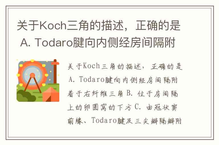 关于Koch三角的描述,正确的是 A. Todaro腱向内侧经房间隔附着于右纤维三角 B. 位于房间隔上的卵圆窝的下方 C. 由冠状窦前缘、Todaro腱及三尖瓣隔瓣附着线围成 D. 三角前部心内膜下为房室结位置 E. 三角的尖对着膜性室间隔