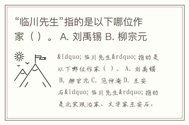 “临川先生”指的是以下哪位作家( )。 A. 刘禹锡 B. 柳宗元 C. 范仲淹 D. 王安石