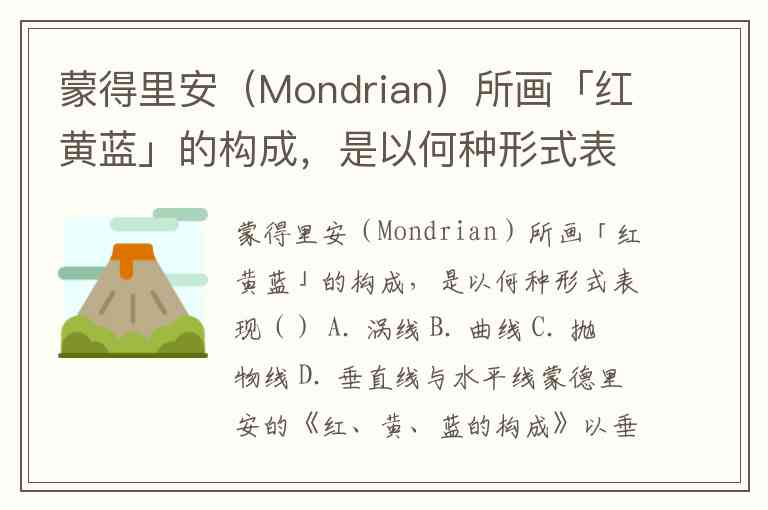 蒙得里安(Mondrian)所画「红黄蓝」的构成,是以何种形式表现() A. 涡线 B. 曲线 C. 抛物线 D. 垂直线与水平线