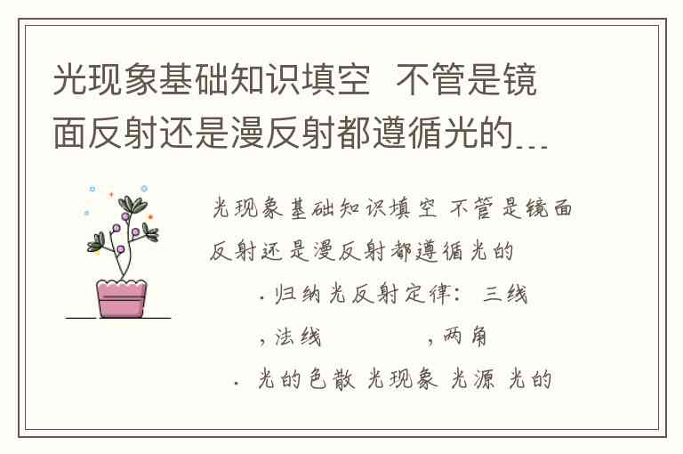 光现象基础知识填空 不管是镜面反射还是漫反射都遵循光的﹍﹍﹍﹍.归纳光反射定律:三线﹍﹍﹍﹍,法线﹍﹍﹍﹍,两角﹍﹍﹍﹍. 光的色散 光现象 光源 光的传播 在同种均匀介质中,光是沿﹍﹍﹍﹍传播 光的传播不需要介质,光是真空中的传播速度是﹍﹍﹍﹍m/s 光照射到物体表面时,会发 生反射 光照射到粗糙物体表面时,会发生﹍﹍﹍光照射到光滑物体表面时,会发生﹍﹍﹍平面镜成像:﹍﹍﹍﹍发光的物体叫做光源.光源可分为﹍﹍﹍光源和﹍﹍光源 光能使周围变得明亮,变得温暖,还能使胶卷感光,这些现象表明﹍﹍﹍﹍ 通过三棱镜,太阳光可以分解成﹍﹍﹍﹍﹍﹍﹍﹍﹍﹍﹍﹍等色光.我们把﹍﹍﹍﹍﹍﹍称为光的三原色.透明物体的颜色是由它﹍﹍﹍﹍的色光决定的;不透明物体的颜色是由它﹍﹍﹍﹍色光决定的.若某物体它能反射所有的色光,则它是﹍﹍﹍﹍色;若它能通过所有的色光则它是﹍﹍﹍﹍色.光的色散区域中,红光外侧的不可见光叫做﹍﹍﹍﹍,它具有﹍﹍效应,主要应用有﹍﹍﹍﹍﹍﹍﹍﹍;光的色散区域中,紫光外侧的不可见光叫做﹍﹍﹍﹍,它具有﹍﹍﹍﹍效应,主要应用有﹍﹍﹍﹍﹍﹍﹍﹍.应用 平面镜成的像是﹍﹍﹍﹍像,像的大小与物体的大 小﹍﹍﹍﹍,像和物到平面镜的距离﹍﹍﹍﹍,像 与物关于镜面是﹍﹍﹍﹍的