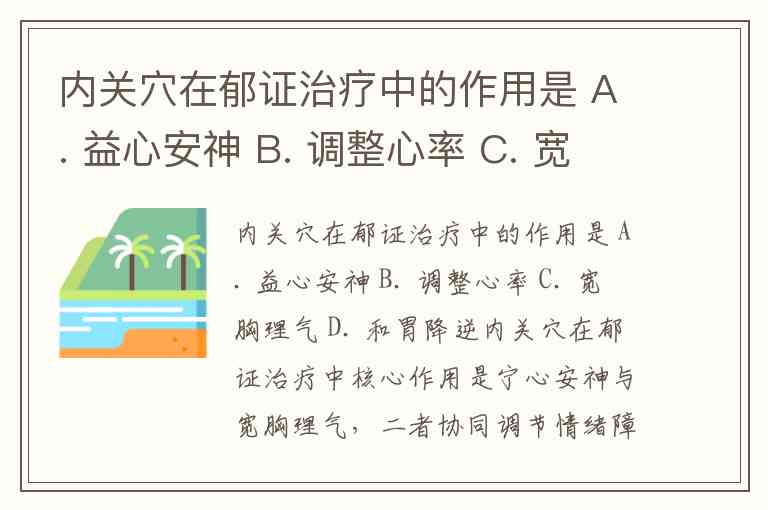 内关穴在郁证治疗中的作用是 A. 益心安神 B. 调整心率 C. 宽胸理气 D. 和胃降逆
