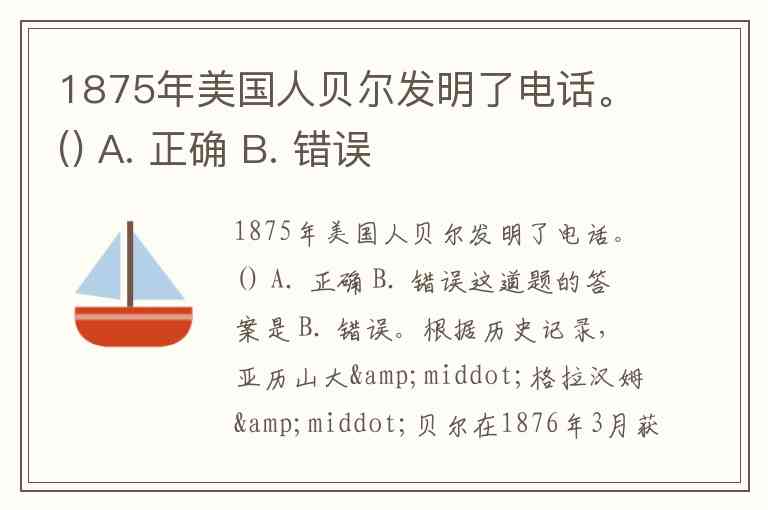1875年美国人贝尔发明了电话。() A. 正确 B. 错误