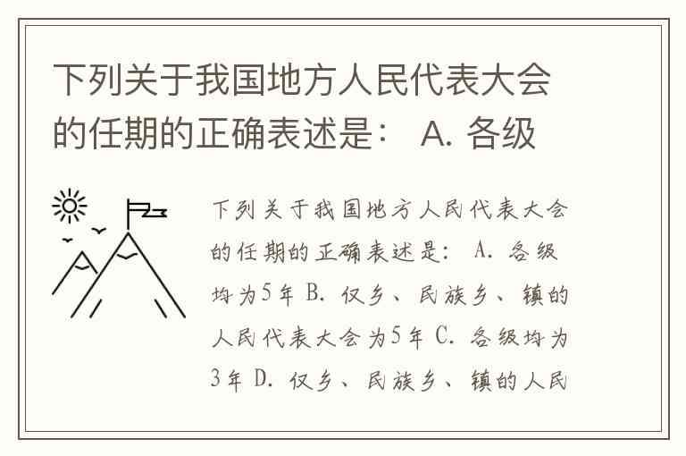 下列关于我国地方人民代表大会的任期的正确表述是: A. 各级均为5年 B. 仅乡、民族乡、镇的人民代表大会为5年 C. 各级均为3年 D. 仅乡、民族乡、镇的人民代表大会为3年