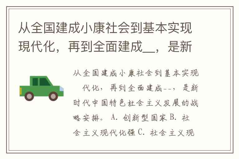 从全国建成小康社会到基本实现現代化,再到全面建成__,是新时代中国特色杜会主义发展的战略安排。 A. 创新型国家 B. 社会主义现代化强 C. 社会主义现代化大国 D. 世界一流强国