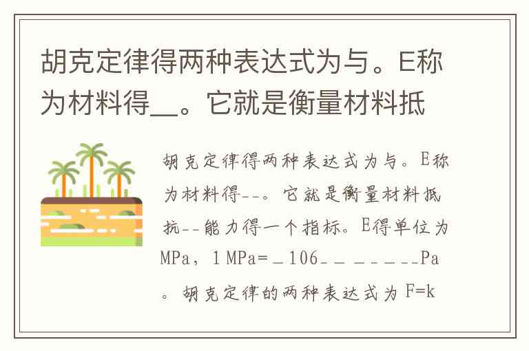 胡克定律得两种表达式为与。E称为材料得__。它就是衡量材料抵抗__能力得一个指标。E得单位为MPa,1 MPa=_106_______Pa。