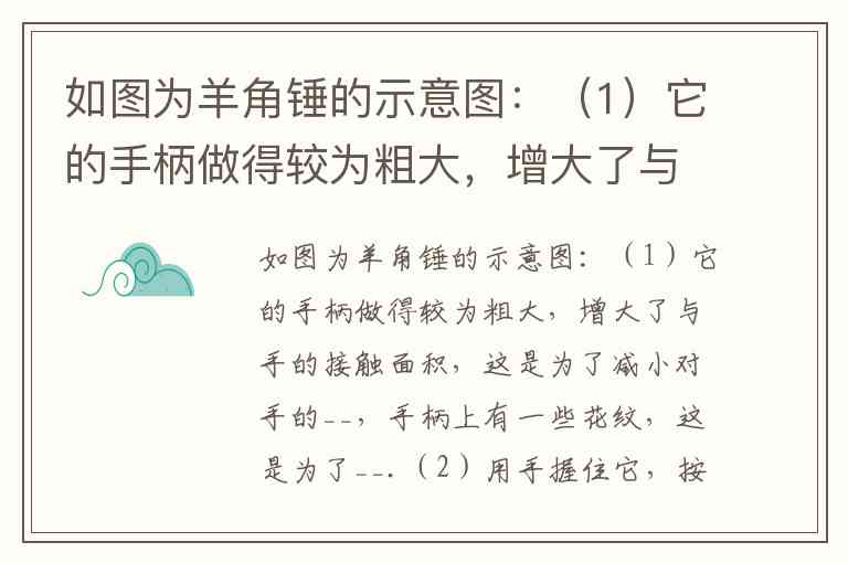 如图为羊角锤的示意图:(1)它的手柄做得较为粗大,增大了与手的接触面积,这是为了减小对手的__,手柄上有一些花纹,这是为了__.(2)用手握住它,按图示方法拔钉子时,它是一个__杠杆.