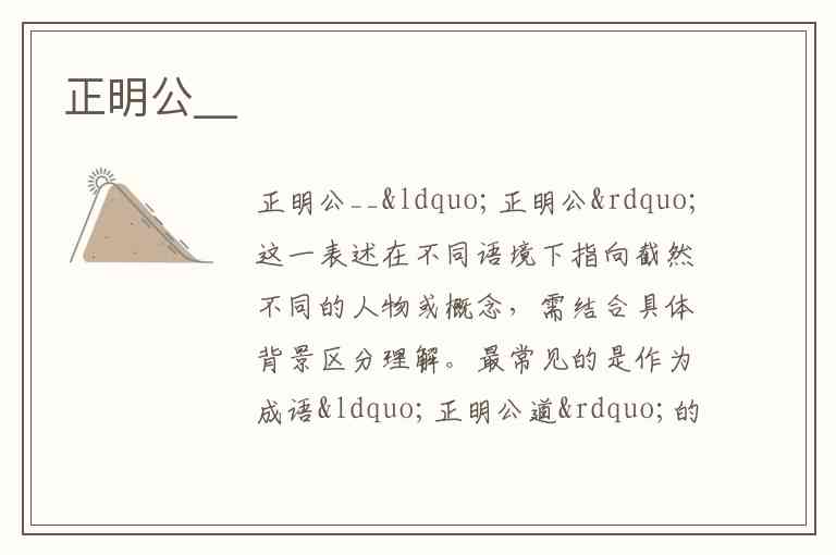“正明公”这一表述在不同语境下指向截然不同的人物或概念,需结合具体背景区分理解。最常见的是作为成语“正明公道”的缩略,意为行为端正、光明磊落,源自清代小说《醒世姻缘传》第二十二回的对话:“你要是正明公道的人,没的敢说你不是个大的们!”。这里的“正明”强调正直无私,“公道”指公平合理,合起来形容人处事光明正大,不徇私情。