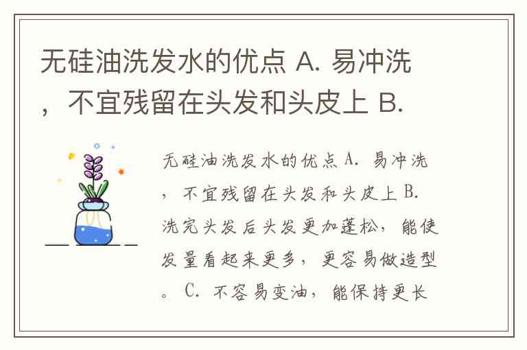 无硅油洗发水的优点 A. 易冲洗,不宜残留在头发和头皮上 B. 洗完头发后头发更加蓬松,能使发量看起来更多,更容易做造型。 C. 不容易变油,能保持更长时间的清爽 D. 够保养头皮,抗菌、抗氧化, 更不容易脱发 。