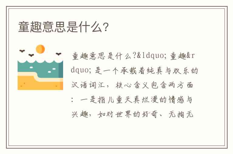 “童趣”是一个承载着纯真与欢乐的汉语词汇,核心含义包含两方面:一是指儿童天真烂漫的情感与兴趣,如对世界的好奇、无拘无束的想象力和直接的情感表达;二是特指童年时期的乐趣,那些长大后回忆起来仍觉温暖的片段,比如“在乡下和邻居一起到田里钓青蛙的那段童趣”。这种特质不仅属于儿童,也可引申为成年人在行为或艺术创作中展现的类似天真感,比如动画片中的拟人角色、色彩鲜明的儿童绘本,或是成年人偶尔抛开世俗束缚的游戏心态。