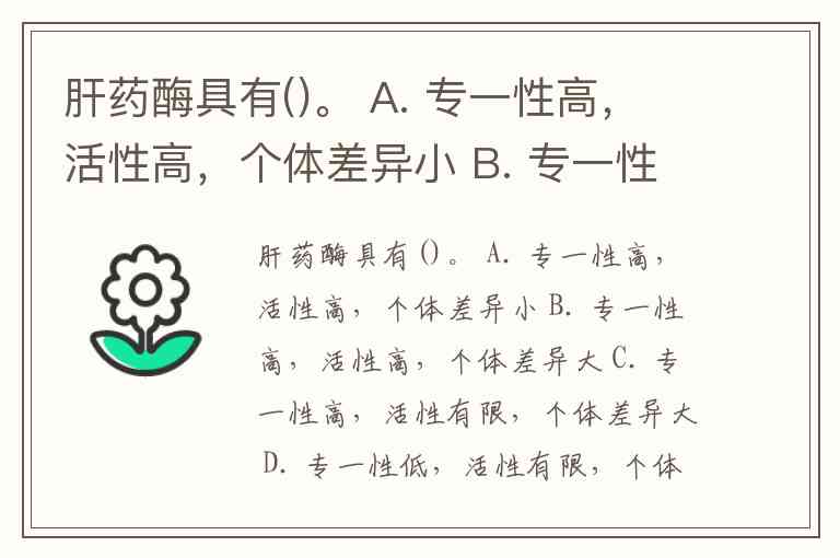 肝药酶具有()。 A. 专一性高,活性高,个体差异小 B. 专一性高,活性高,个体差异大 C. 专一性高,活性有限,个体差异大 D. 专一性低,活性有限,个体差异大 E. 专一性低,活性有限,个体差异小