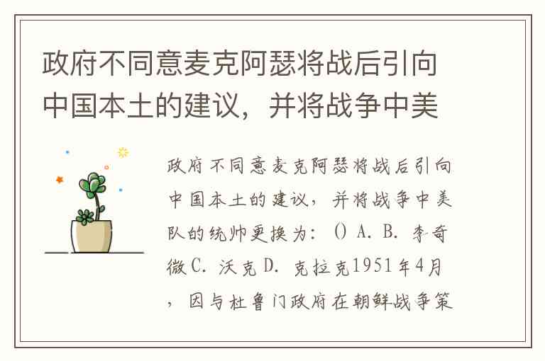 政府不同意麦克阿瑟将战后引向中国本土的建议,并将战争中美队的统帅更换为:() A. B. 李奇微 C. 沃克 D. 克拉克
