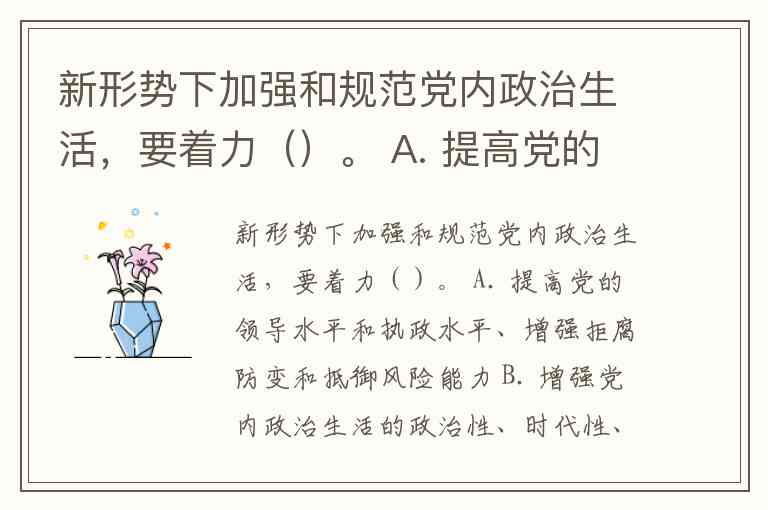新形势下加强和规范党内政治生活,要着力()。 A. 提高党的领导水平和执政水平、增强拒腐防变和抵御风险能力 B. 增强党内政治生活的政治性、时代性、原则性、战斗性 C. 增强党自我净化、自我完善、自我革新、自我提高能力 D. 维护党中央权威、保证党的团结统一、保持党的先进性和纯洁性