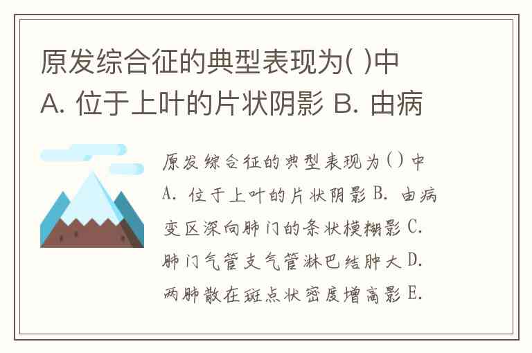 A. 位于上叶的片状阴影:原发病灶虽可位于上叶下部,但“片状阴影”仅描述了原发灶本身,未包含淋巴管炎和淋巴结肿大,不能完整体现原发综合征特征。