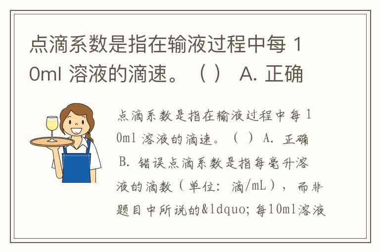点滴系数是指在输液过程中每 10ml 溶液的滴速。( ) A. 正确 B. 错误