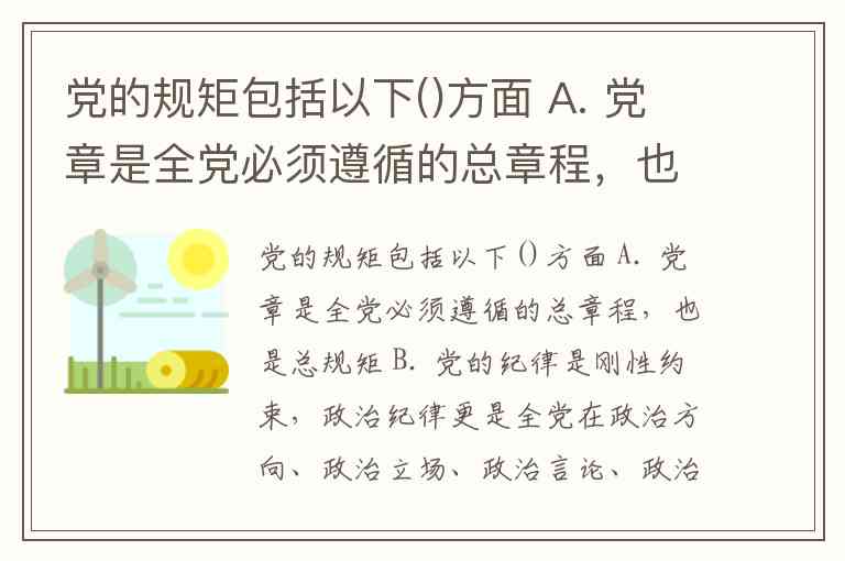 党的规矩包括以下()方面 A. 党章是全党必须遵循的总章程,也是总规矩 B. 党的纪律是刚性约束,政治纪律更是全党在政治方向、政治立场、政治言论、政治行动方面必须遵守的刚性约束; C. 国家法律是党员、干部必须遵守的规矩; D. 党在长期实践中形成的优良传统和工作惯例。