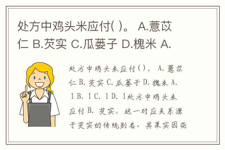 处方中鸡头米应付( )。 A.薏苡仁 B.芡实 C.瓜蒌子 D.槐米 A. 1 B. 1 C. 1 D. 1