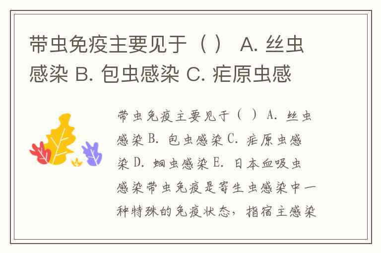 带虫免疫主要见于( ) A. 丝虫感染 B. 包虫感染 C. 疟原虫感染 D. 蛔虫感染 E. 日本血吸虫感染