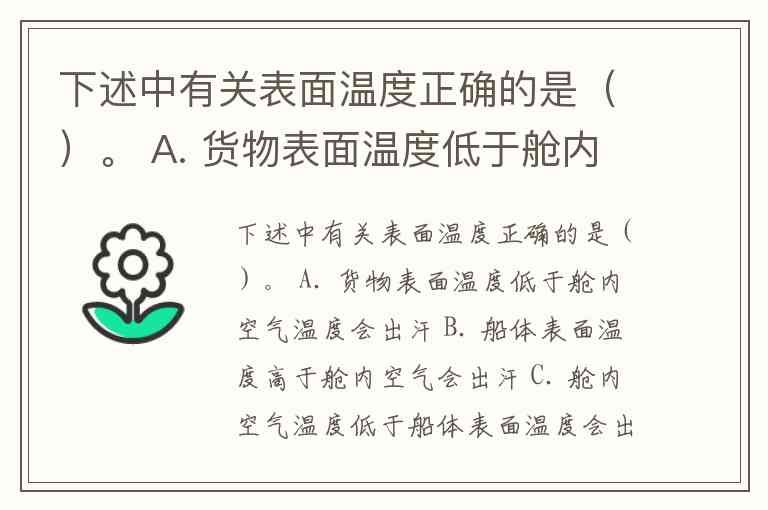 下述中有关表面温度正确的是()。 A. 货物表面温度低于舱内空气温度会出汗 B. 船体表面温度高于舱内空气会出汗 C. 舱内空气温度低于船体表面温度会出汗 D. 舱内空气高于船体表面温度会出汗