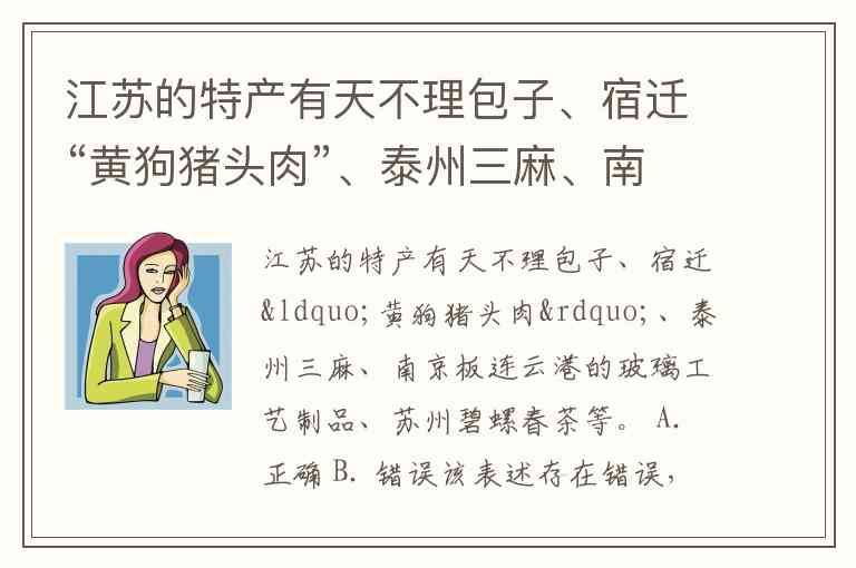 江苏的特产有天不理包子、宿迁“黄狗猪头肉”、泰州三麻、南京板连云港的玻璃工艺制品、苏州碧螺春茶等。 A. 正确 B. 错误