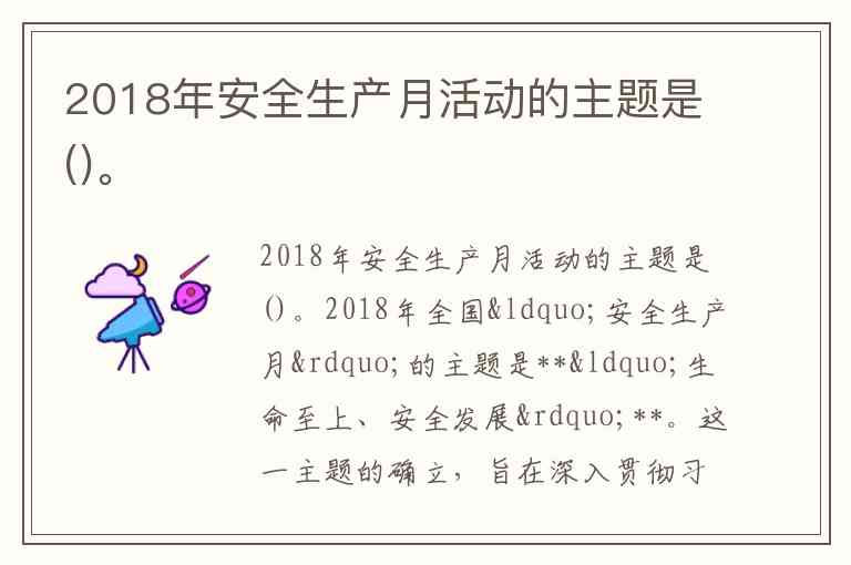 2018年全国“安全生产月”的主题是**“生命至上、安全发展”**。这一主题的确立,旨在深入贯彻习近平新时代中国特色社会主义思想和党中央关于安全生产的决策部署,强化全社会对生命价值的敬畏和安全发展理念的认同。作为我国第17个“安全生产月”,当年各地通过政策文件、启动仪式、宣传标语等多种形式广泛传播这一主题,例如湖南省安委会在通知中明确引用该主题,广东省东莞市住建系统在活动启动时也突出这一核心思想。