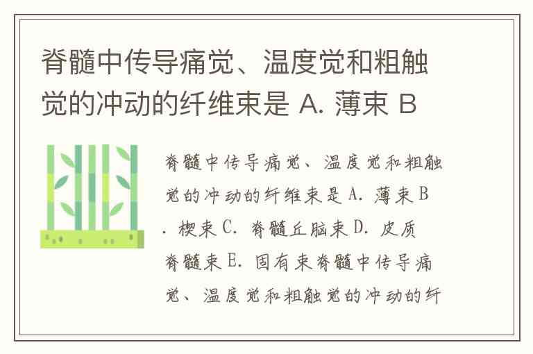 脊髓中传导痛觉、温度觉和粗触觉的冲动的纤维束是 A. 薄束 B. 楔束 C. 脊髓丘脑束 D. 皮质脊髓束 E. 固有束