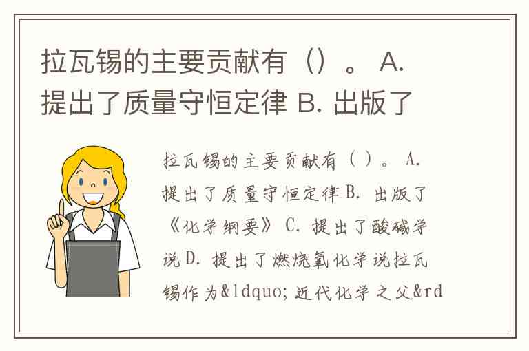 拉瓦锡的主要贡献有()。 A. 提出了质量守恒定律 B. 出版了《化学纲要》 C. 提出了酸碱学说 D. 提出了燃烧氧化学说