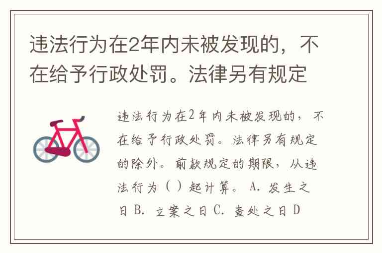违法行为在2年内未被发现的,不在给予行政处罚。法律另有规定的除外。前款规定的期限,从违法行为()起计算。 A. 发生之日 B. 立案之日 C. 查处之日 D. 举报之日