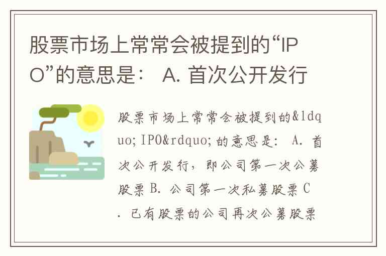 股票市场上常常会被提到的“IPO”的意思是: A. 首次公开发行,即公司第一次公募股票 B. 公司第一次私募股票 C. 已有股票的公司再次公募股票 D. 已有股票的公司再次私募股票