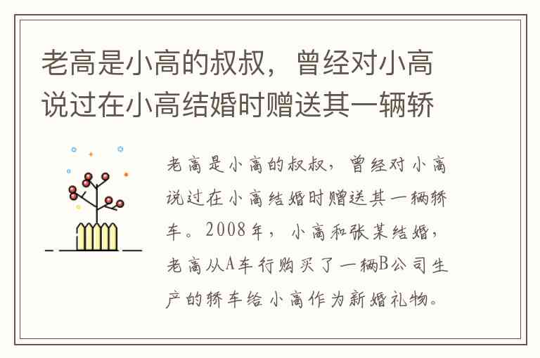 该轿车属于小高与张某的夫妻共同财产。根据《民法典》第1062条和第1063条规定,婚姻关系存续期间受赠的财产原则上属于夫妻共同财产,除非赠与人明确表示只赠与一方。本案中,老高在小高结婚时赠车的行为发生于2008年婚姻关系存续期间,且现有信息未显示老高通过书面合同或明确声明等方式限定车辆仅归小高个人所有。尽管赠与人老高是小高的叔叔(亲属关系),但司法实践中,亲属身份本身并不等同于“明确只赠与一方”的意思表示,仍需通过赠与合同、公证文书或其他书面证据佐证。