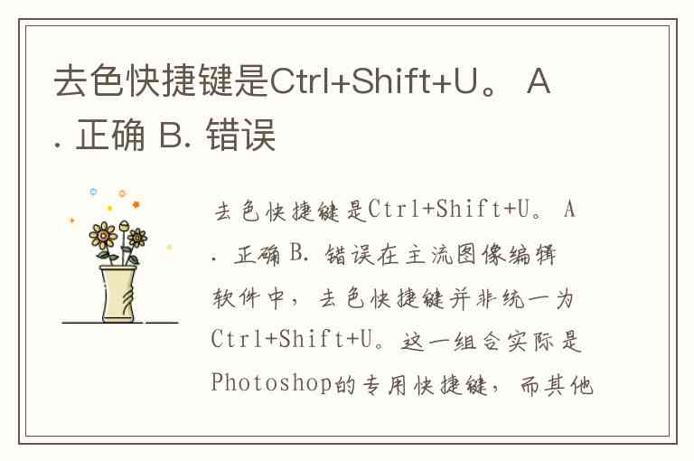 去色快捷键是Ctrl+Shift+U。 A. 正确 B. 错误