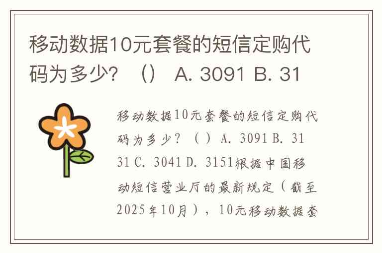 移动数据10元套餐的短信定购代码为多少?() A. 3091 B. 3131 C. 3041 D. 3151
