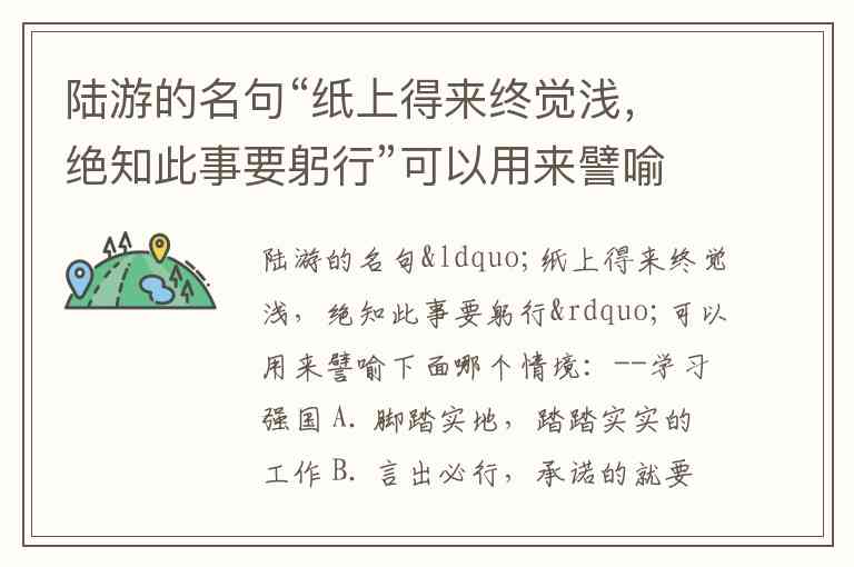 陆游的名句“纸上得来终觉浅,绝知此事要躬行”可以用来譬喻下面哪个情境:--学习强国 A. 脚踏实地,踏踏实实的工作 B. 言出必行,承诺的就要实现 C. 团结协作,注重团队的力量 D. 知行合一,将知识化为实践