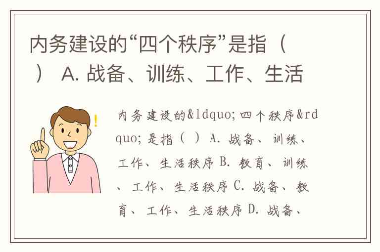内务建设的“四个秩序”是指( ) A. 战备、训练、工作、生活秩序 B. 教育、训练、工作、生活秩序 C. 战备、教育、工作、生活秩序 D. 战备、训练、管理、工作秩序