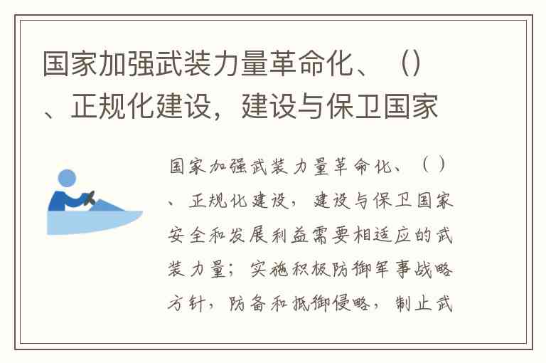 国家加强武装力量革命化、()、正规化建设,建设与保卫国家安全和发展利益需要相适应的武装力量;实施积极防御军事战略方针,防备和抵御侵略,制止武装颠覆和分裂;开展国际军事安全合作,实施联合国维和、国际救援、海上护航和维护国家海外利益的军事行动,维护国家主权、安全、领土完整、发展利益和世界和平。 A. 军事化 B. 现代化 C. 信息化 D. 科技化
