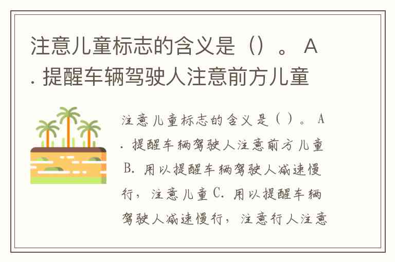 注意儿童标志的含义是()。 A. 提醒车辆驾驶人注意前方儿童 B. 用以提醒车辆驾驶人减速慢行,注意儿童 C. 用以提醒车辆驾驶人减速慢行,注意行人