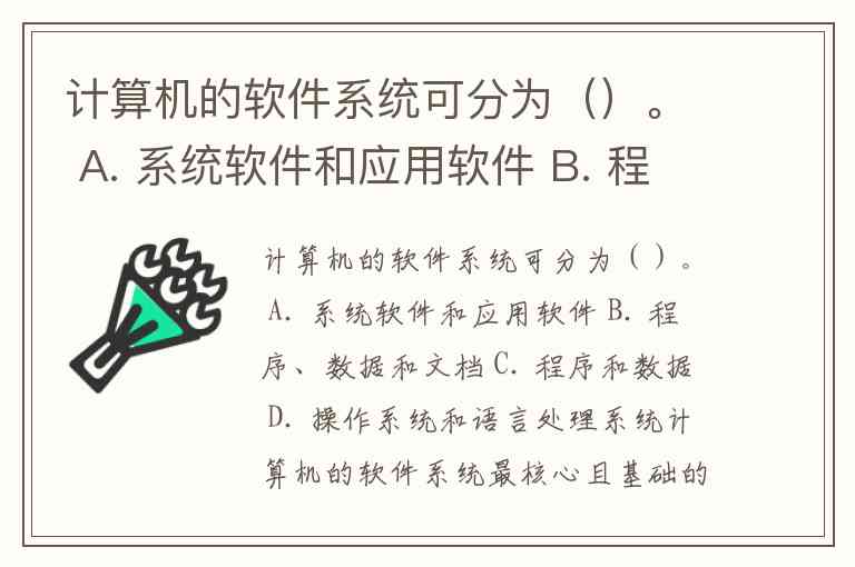 计算机的软件系统可分为()。 A. 系统软件和应用软件 B. 程序、数据和文档 C. 程序和数据 D. 操作系统和语言处理系统