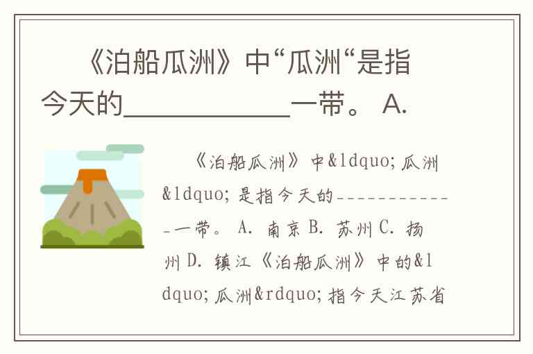 《泊船瓜洲》中“瓜洲“是指今天的____________一带。 A. 南京 B. 苏州 C. 扬州 D. 镇江