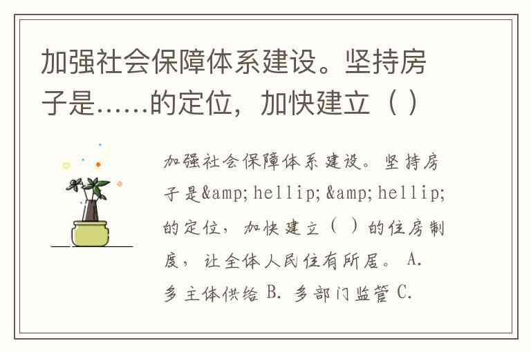 加强社会保障体系建设。坚持房子是……的定位,加快建立( )的住房制度,让全体人民住有所居。 A. 多主体供给 B. 多部门监管 C. 租购并举 D. 多渠道保障